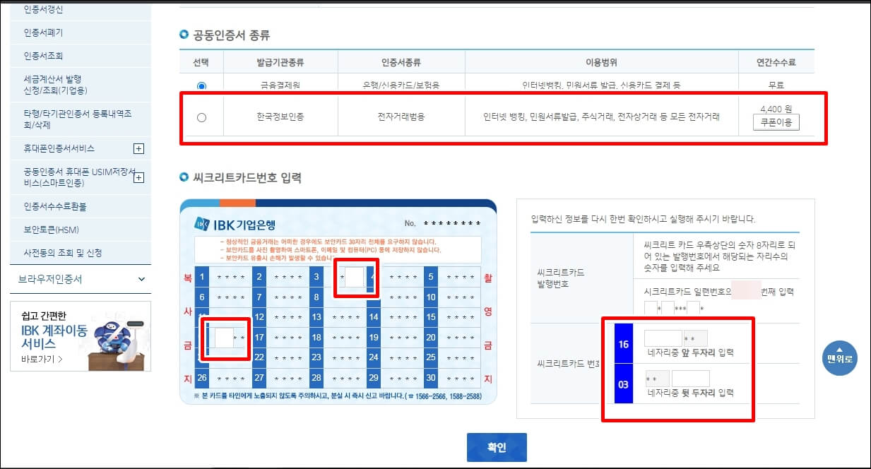 발급기관 종류에서 한국 정보인증을 선택하시고 시크릿 발행번호 및 번호를 입력해주신 다음 확인을 클릭합니다.