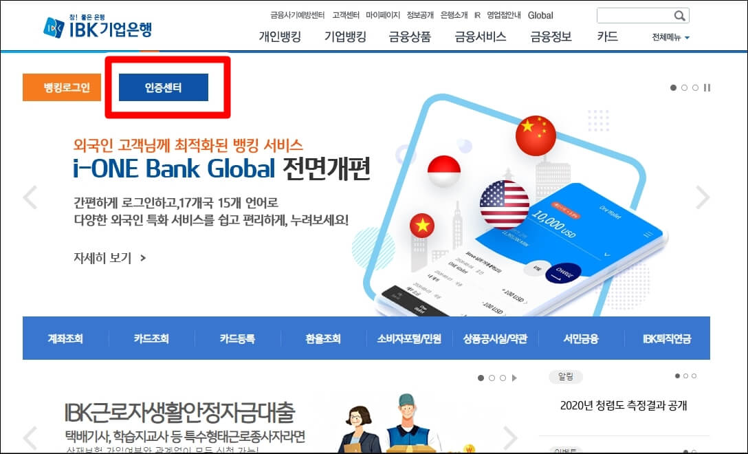 기업은행 사이트에 접속했습니다. 좌측 상단에 인증센터를 클릭합니다.
