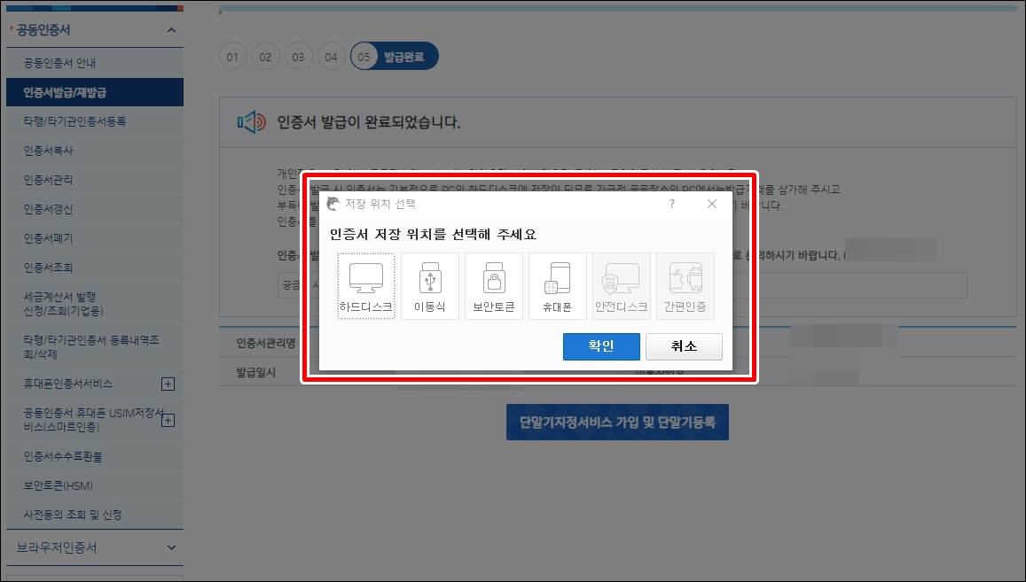 인증서 저장 위치를 선택해 주시고 확인을 클릭합니다. 인증서는 컴퓨터를 컴퓨터에 보관하시는 것은 상당히 위험하므로 휴대용 USB에 보관하시길 바랍니다.