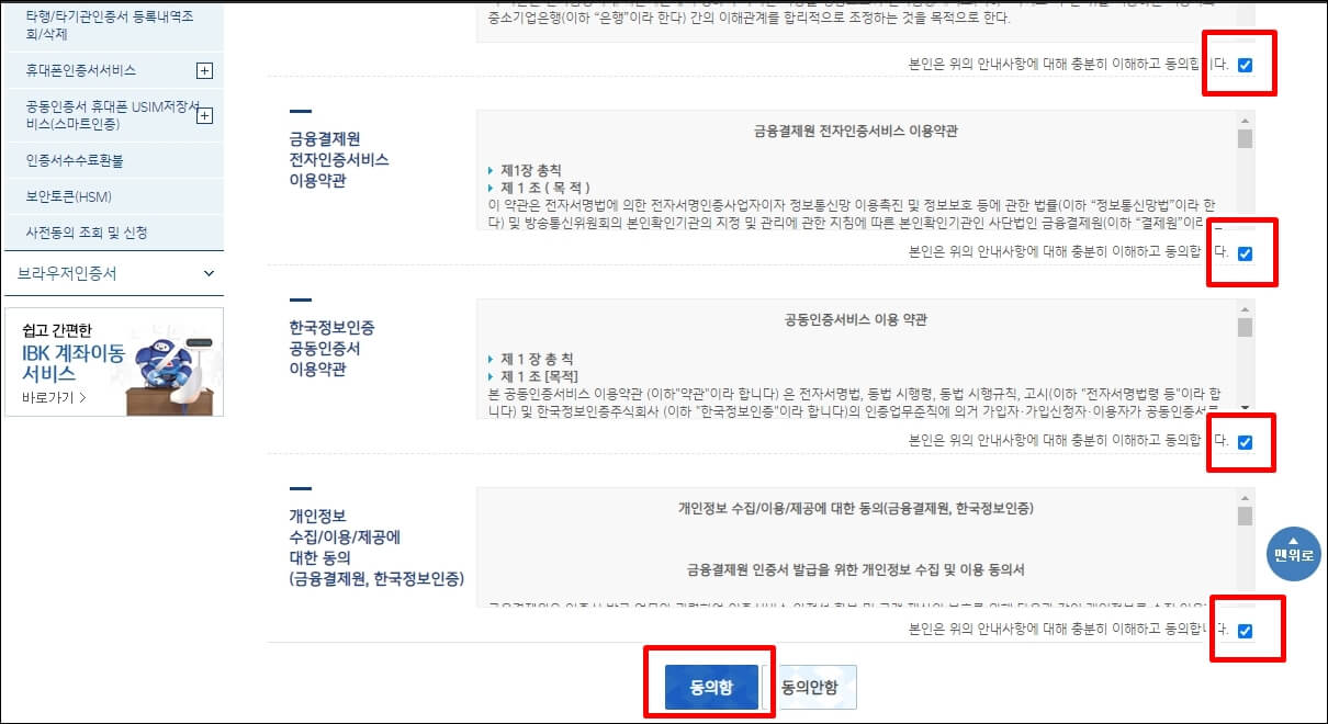 금융결제원, 한국 정보인증, 개인정보 수집 이용 등을 읽어보시고 동의합니다에 체크하신 후에 동의함을 클릭합니다.