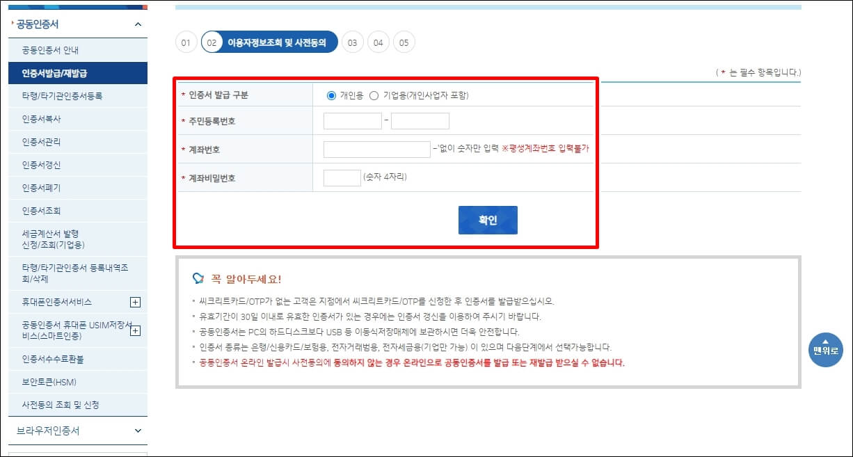 인증서 발급 구분, 주민등록번호, 계좌번호, 계좌 비밀번호 등을 입력하시고 확인을 클릭합니다.