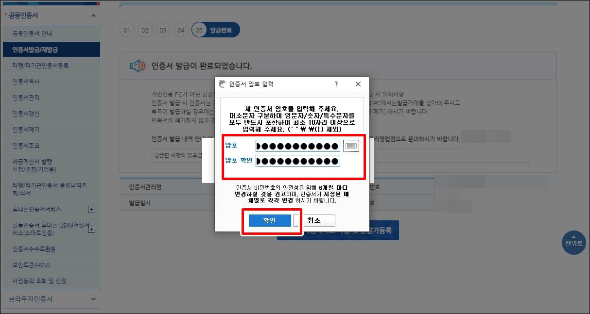 마지막으로 암호 및 암호 확인에 10자리 이상의 암호를 입력해 주시고 확인을 누르시면 발행이 완료됩니다. 범용 공동 인증서 또한 폐지되기 전에 발급받으신 분들은 갱신 날까지 사용이 가능하시고 그 후로는 공동 인증서로 발급을 받으셔야 합니다.