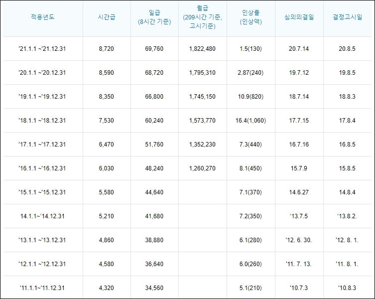 그래서 오늘은 주 40 시간 최저 임금 8,720원을 기준으로 2021년 일급, 주급, 월급, 연봉 계산에 대한 정보를 가지고 왔습니다. 또한 최저시급은 어떻게 결정되고 누가 결정하는가 최근 10년 동안에 임금 인상률은 얼마나 올랐는지도 짚어보고 넘어가도록 하겠습니다. 다음 해는 대박을 꿈꾸며 포스팅을 시작해볼까요!?