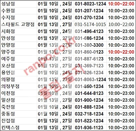 고잔점 과천점 광교점 광명소하점 광명점 김포한강점 남양주점 다산점 동백점 동탄점 별내점 보라점 부천점 분당점 산본점 서수원점 성남점 수원점 수지점 시화점 안성점 안양점 양주점 여주점 오산점 용인점 의왕점 의정부점 이천점 일산점 죽전점 중동점 진접점 킨텍스점 파주 운정점 파주점 평촌점 평택점 포천점 풍산점 하남점 화성 봉담점 화정점 흥덕점