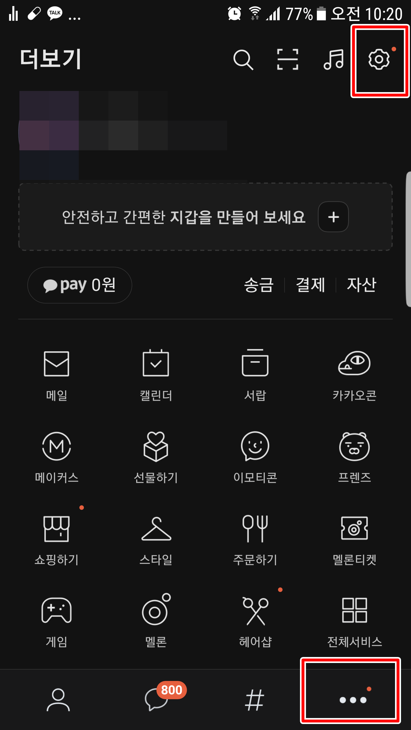 카카오톡 탈퇴와 카카오 계정 탈퇴는 전혀 다른 문제인데요. 탈퇴 방법부터 알아보고 밑에서 이와 관련된 정보를 살펴보도록 하겠습니다. 먼저 카카오톡에 접속하셔서 우측 하단에 메뉴를 누르시고 톱니바퀴를 눌러봅니다.