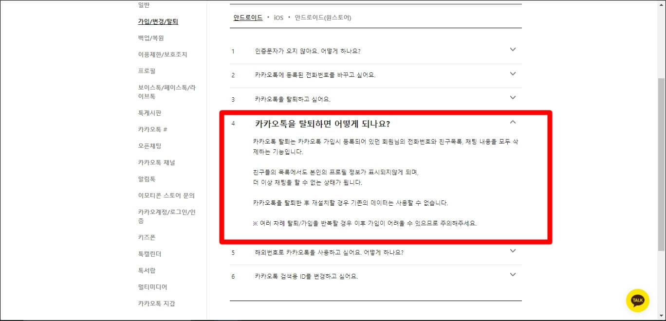 4. 카카오톡을 탈퇴하면 계정도 함께 탈퇴하면