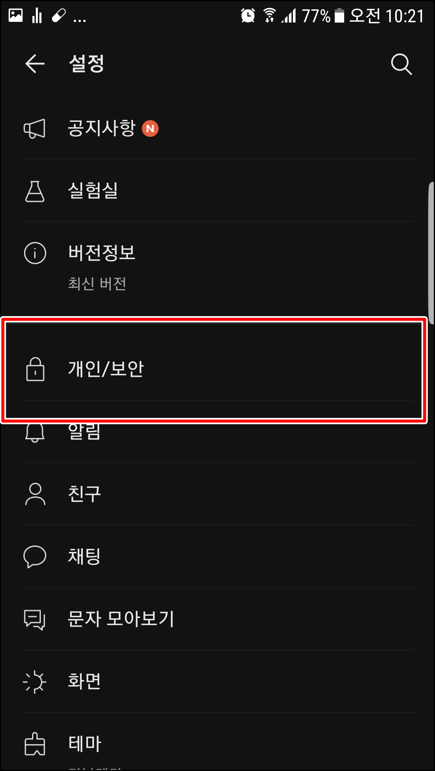 설정 탭에서 [개인/보안]을 눌러봅니다.