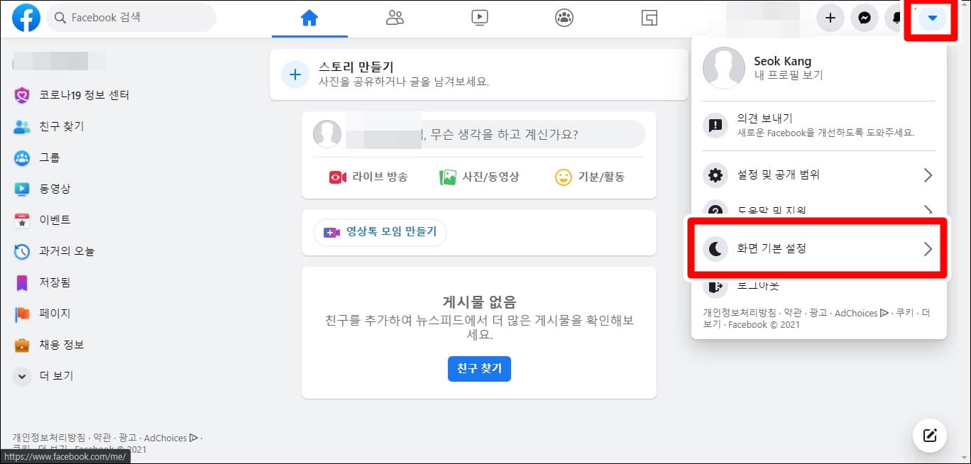 먼저 PC버전에서 적용하는 방법을 알아봅니다. 페이스북에 접속하셔서 로그인을 하신 다음 우측 상단에 화살표를 클릭하시고 [화면 기본 설정]에 들어갑니다.