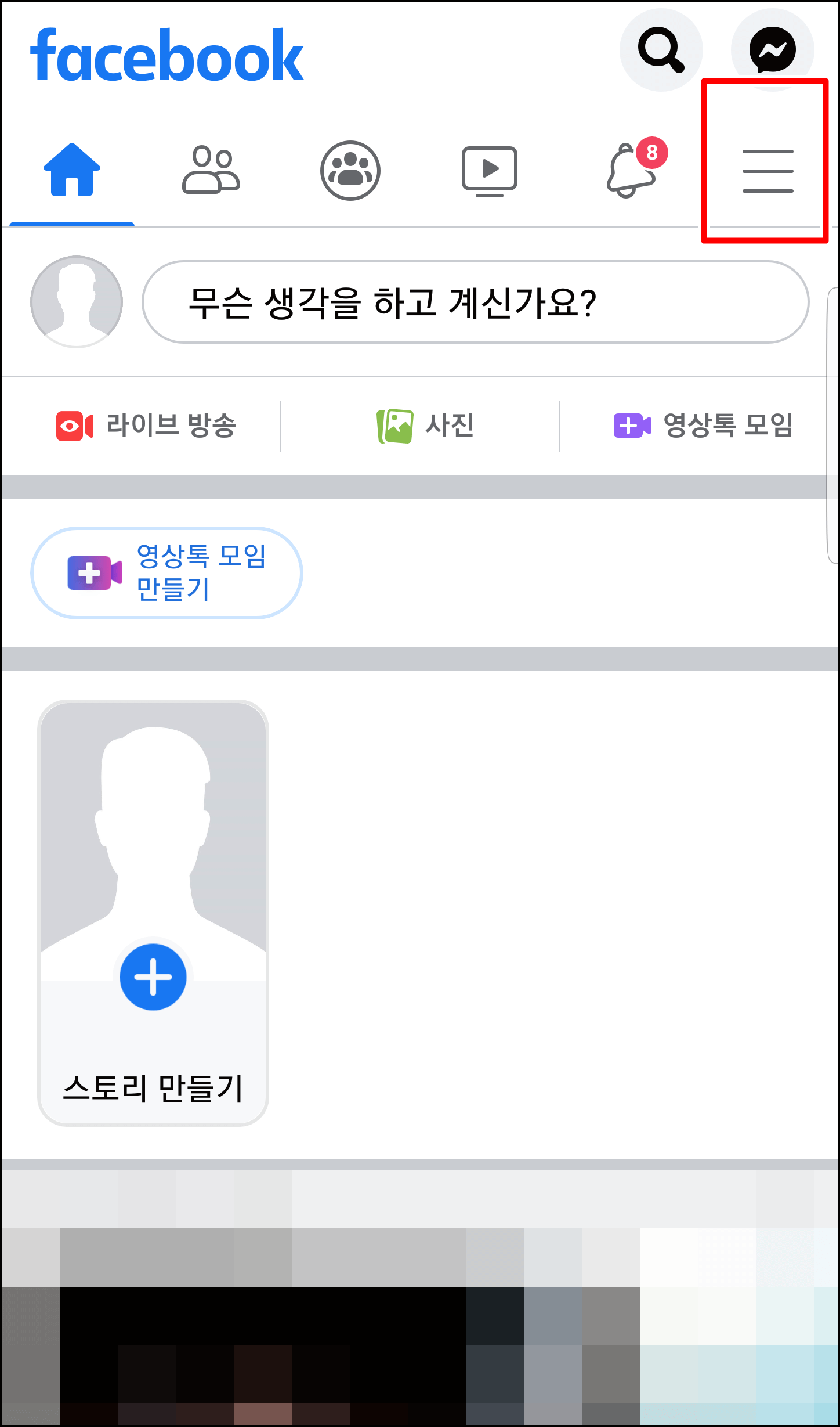 모바일 버전에서 페이스북에 접속하신 다음 우측 상단에 줄 3개짜리 메뉴를 눌러봅니다.