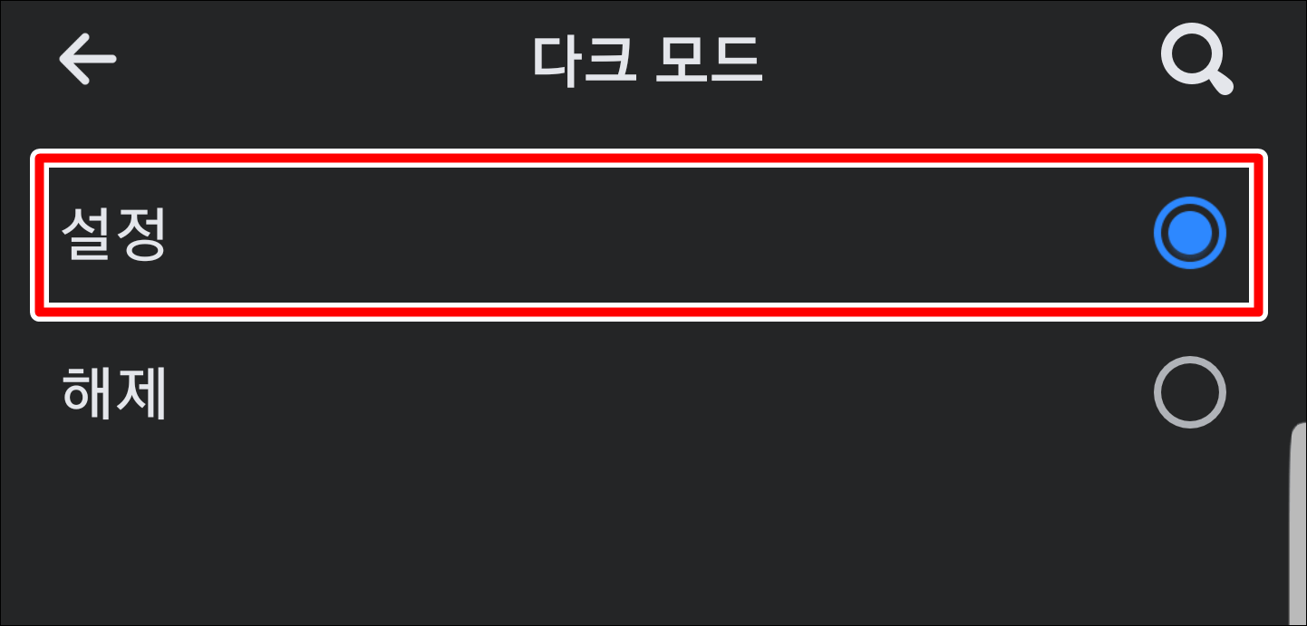 기본적으로 해제로 설정되어 있기 때문에 이것을 설정으로 바꿔 주시면 바로 다크 모드로 전환됩니다.