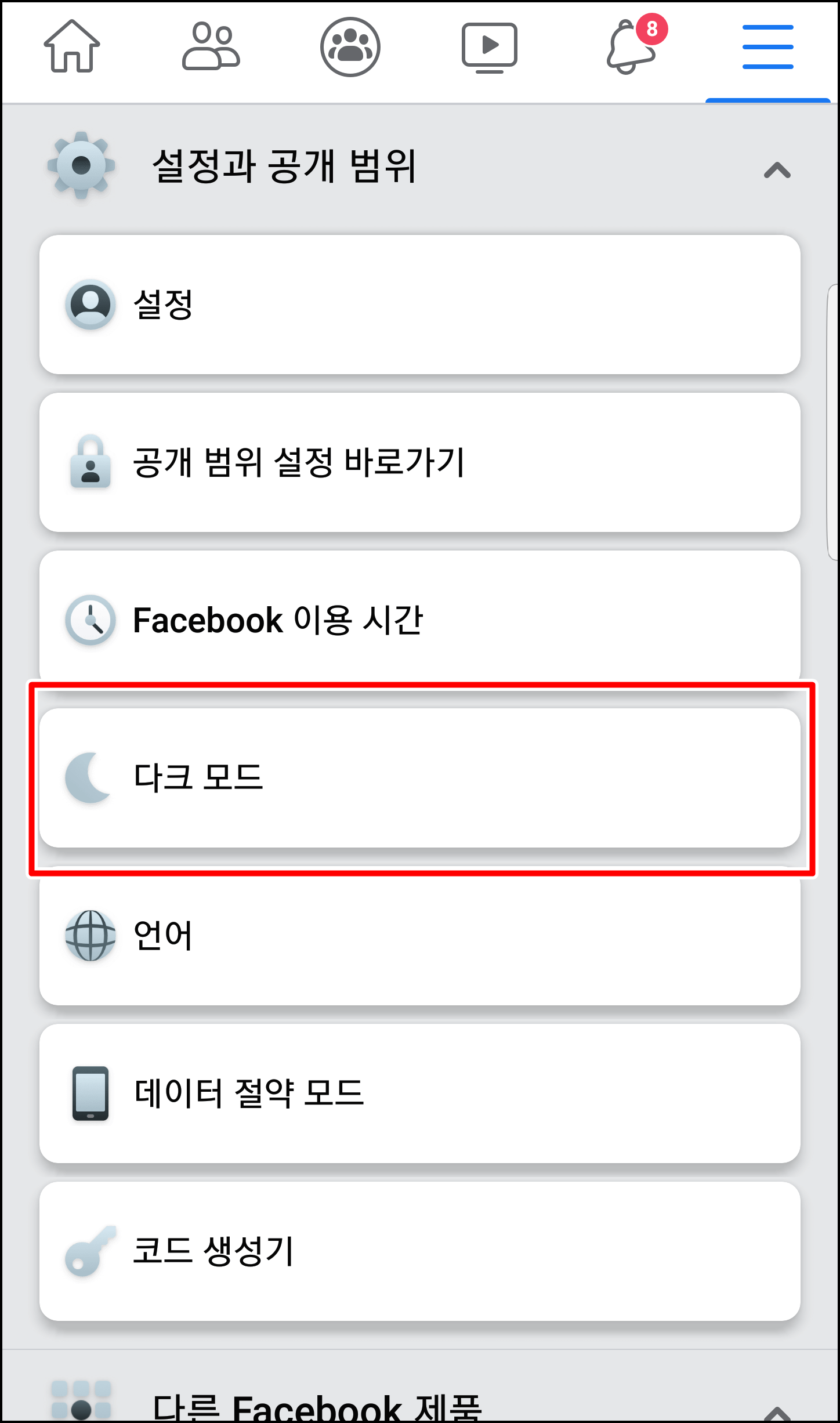 2. 페이스북 모바일 버전 다크 모드