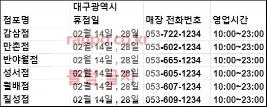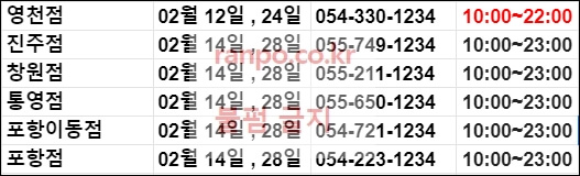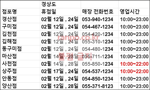 경산점, 구미점, 김천점, 김해점, 동구미점, 마산점, 사천점, 상주점, 안동점, 양산점, 영천점, 진주점, 창원점, 통영점, 포항이동점, 포항점
