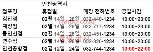 검단점, 계양점, 동인천점, 연수점, 인천공항점