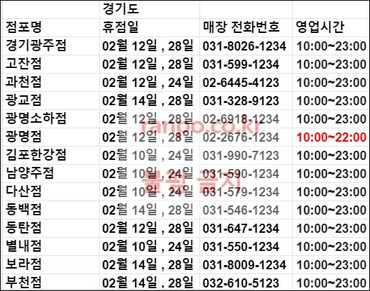 고잔점, 과천점, 광교점, 광명소하점, 광명점, 김포한강점, 남양주점, 다산점, 동백점, 동탄점, 별내점, 보라점, 부천점, 분당점, 산본점, 서수원점, 성남점, 수원점, 수지점, 시화점, 안성점, 안양점, 양주점, 여주점, 오산점, 용인점 의왕점, 의정부점, 이천점, 일산점, 죽전점, 중동점, 진접점, 킨텍스점, 파주 운정점, 파주점, 평촌점, 평택점, 포천점, 풍산점, 하남점, 화성 봉담점, 화정점, 흥덕점
