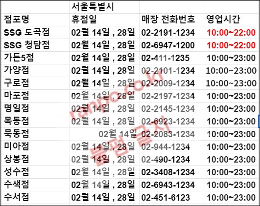 SSG 도곡점, SSG 청담점, 가든 5점, 가양점, 구로점, 마포점, 명일점, 목동점, 미아점, 상봉점, 성수점, 수색점, 수서점, 신도림점, 신월점, 신촌점, 양재점, 여의도점, 역삼점, 영등포점, 왕십리점, 용산점, 월계점, 은평점, 이문점, 이수점, 자양점, 창동점, 천호점, 청계천점, 하월곡점