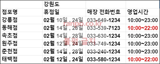 경산점, 구미점, 김천점, 김해점, 동구미점, 마산점, 사천점, 상주점, 안동점, 양산점, 영천점, 진주점, 창원점, 통영점, 포항이동점, 포항점