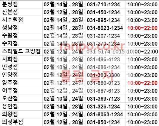 고잔점, 과천점, 광교점, 광명소하점, 광명점, 김포한강점, 남양주점, 다산점, 동백점, 동탄점, 별내점, 보라점, 부천점, 분당점, 산본점, 서수원점, 성남점, 수원점, 수지점, 시화점, 안성점, 안양점, 양주점, 여주점, 오산점, 용인점 의왕점, 의정부점, 이천점, 일산점, 죽전점, 중동점, 진접점, 킨텍스점, 파주 운정점, 파주점, 평촌점, 평택점, 포천점, 풍산점, 하남점, 화성 봉담점, 화정점, 흥덕점