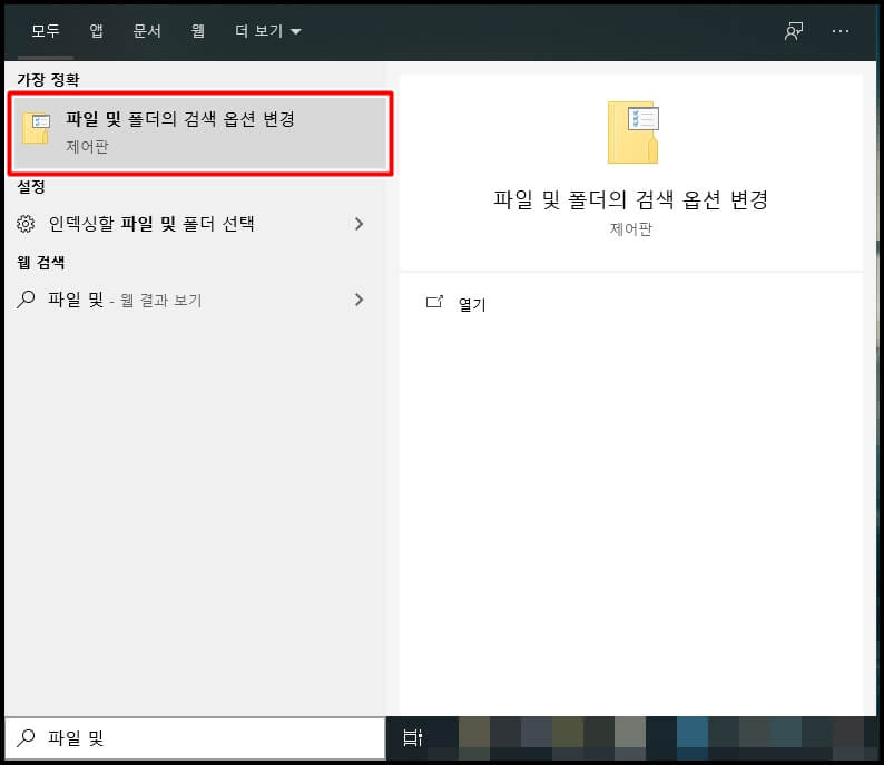Windows 검색창에 '파일 및'이라고 검색하시면 '파일 및 폴더의 검색 옵션 변경'이라는 제어판 항목이 검색됩니다. 이것을 클릭하여 접속합니다.