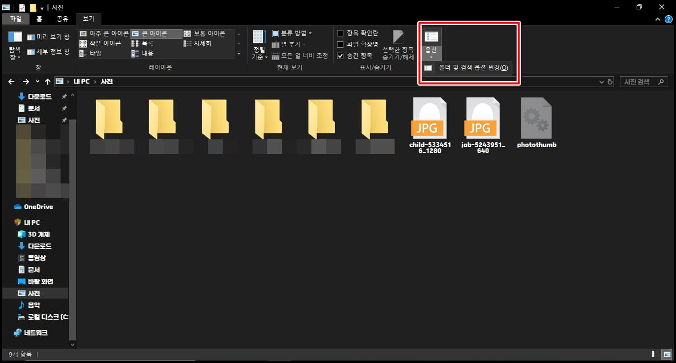 사진 폴더 내에 '보기'를 클릭하신 후 '폴더 및 검색 옵션 변경'을 클릭합니다.