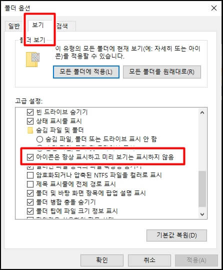 '아이콘은 항상 표시하고 미리 보기는 표시하지 않음'