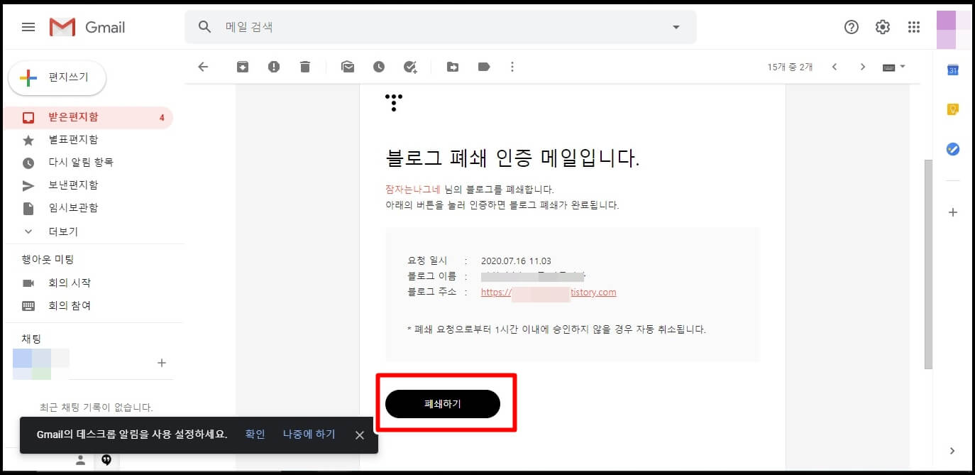 메일로 들어가 보면 요청 일시, 블로그 이름, 블로그 주소 등이 나오는데 폐쇄할 블로그가 맞는지 다시 한번 확인하신 후에 폐쇄하기를 클릭합니다. 폐쇄 요청으로부터 1시간이 지나버리면 자동 취소가 되오니 참고하시길 바랍니다.