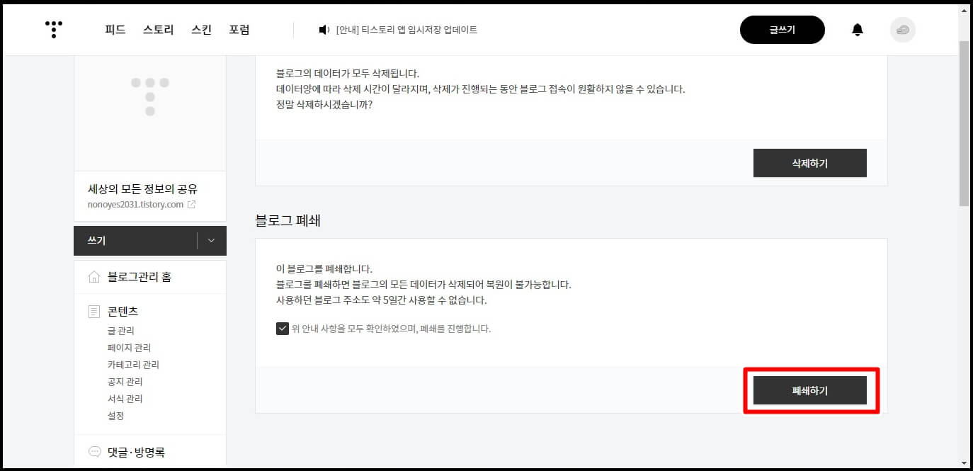 여기서는 2가지의 선택이 가능한데 블로그는 그대로 살려두고 데이터만 모두 삭제할 것인지, 블로그와 데이터 모두를 한 번에 폐쇄할 것인지에 대한 선택이죠. 그러나 거의 대다수가 저품질에 의한 삭제이기 때문에 폐쇄하기를 선택해줍니다.