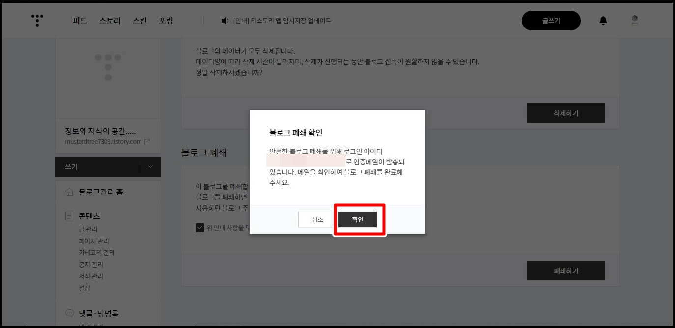 블로그 폐쇄 확인 탭이 뜨면 로그인했던 아이디로 인증메일이 발송된다는 문구가 나옵니다. 확인을 눌러보고 가입했던 이메일로 이동해보겠습니다.