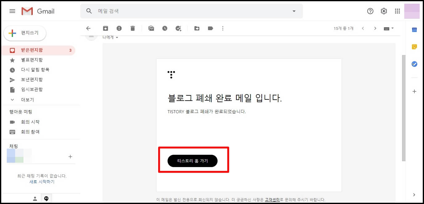 제가 가입했던 G메일입니다. 보시다시피 티스토리 블로그를 폐쇄한다는 인증 메일이 도착해 있습니다. 클릭해서 어떤 내용이 있는지 봐야겠네요.