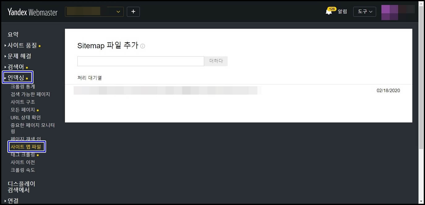 이제는 사이트맵 추가를 해보겠습니다. 좌측에 '인덱싱'을 클릭하시고 '사이트 맵 파일'을 클릭합니다.
