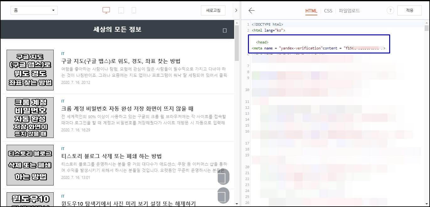 <head> 바로 밑에 부여받은 메타태그를 붙여 넣기 하시고 적용을 클릭하면 소유권 확인에 대한 모든 절차가 끝납니다.