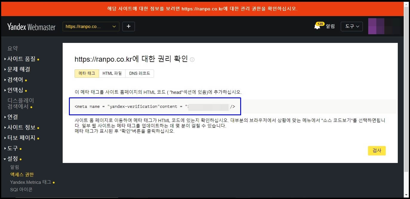 그럼 해당 블로그의 대한 소유권 확인을 위한 메타 태그가 생성되는데 이것을 HTML에 붙여 넣기를 해줍니다.