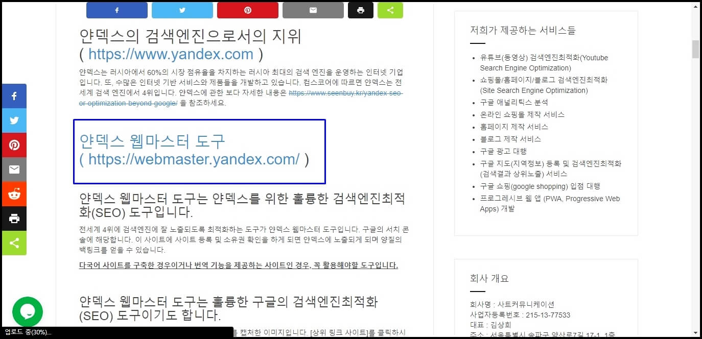 해당 페이지로 넘어가서 아래로 조금 내리시면 '얀덱스 웹마스터 도구' 링크가 나오는데 바로 클릭해봅니다.