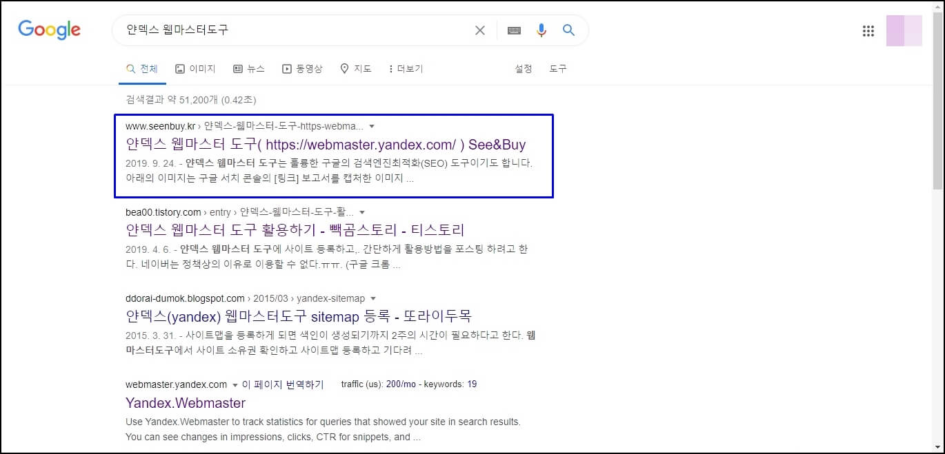 사이트 맵 등록을 하기 전에 먼저 소유권부터 확인해야 합니다. 구글에서 '얀덱스 웹마스터 도구'를 입력하신 후 첫 번째 검색 결과를 클릭합니다.
