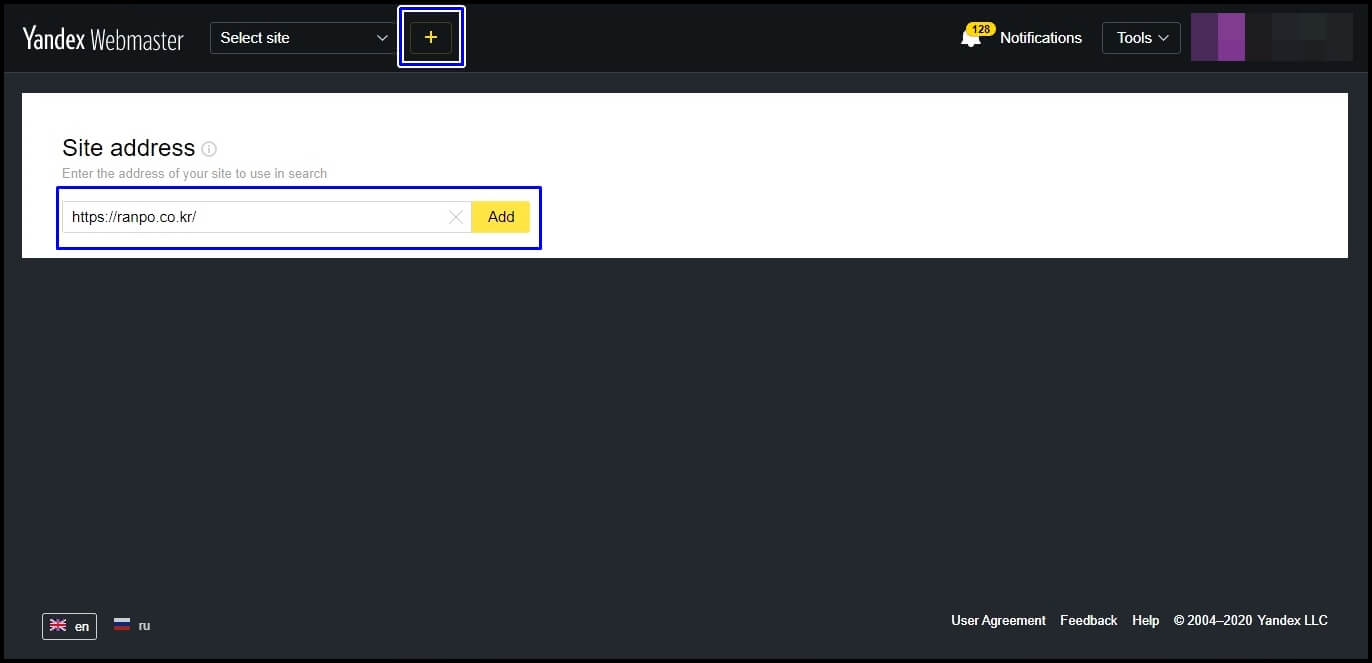 Select site 옆에 +를 누르고 티스토리 블로그 주소를 복사하여 입력하신 다음 Add를 클릭합니다.