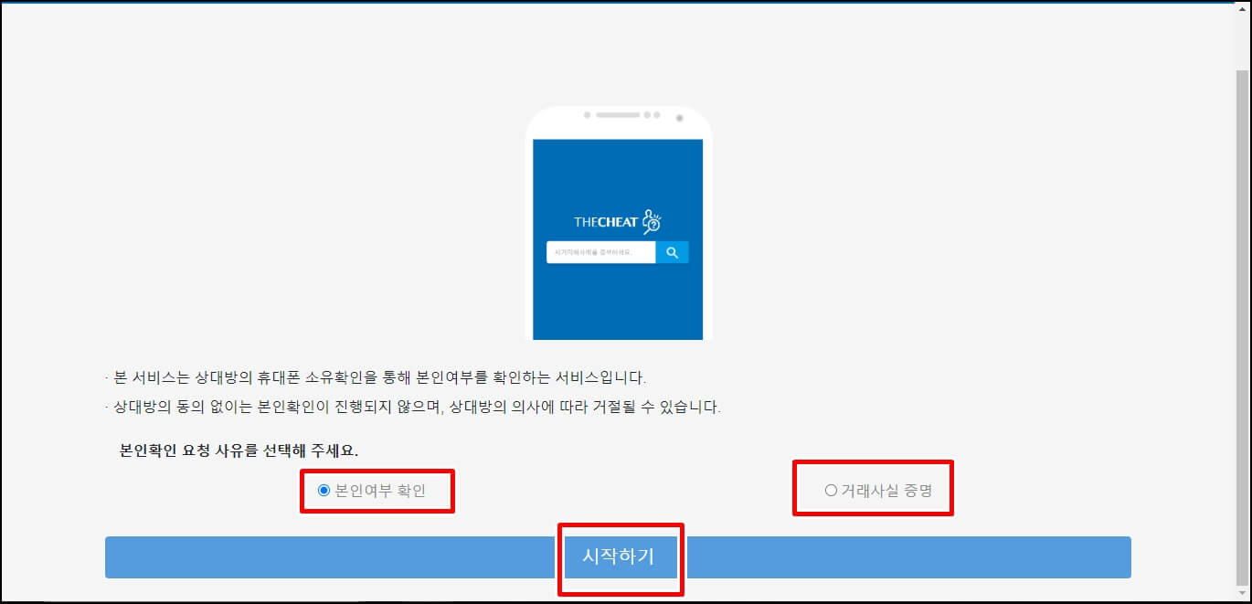 다음으로는 상대방 본인 확인을 클릭해보았습니다. 여기서 '본인여부 확인', '거래사실 증명' 2가지가 나오는데 보통은 '본인여부 확인'을 많이 하기 때문에 본인 '확인 여부 확인'을 선택한 후 '시작하기'를 클릭해보겠습니다.