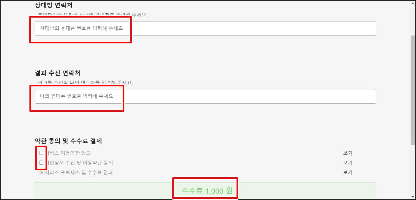 그러면 상대방 연락처와 결과 수신 연락처, 약관 동의 및 수수료 결제에 동의를 하시고 신청을 해주시면 되는데 이때 수수료가 1,000원이 발생된다는 점 참고하시길 바랍니다.