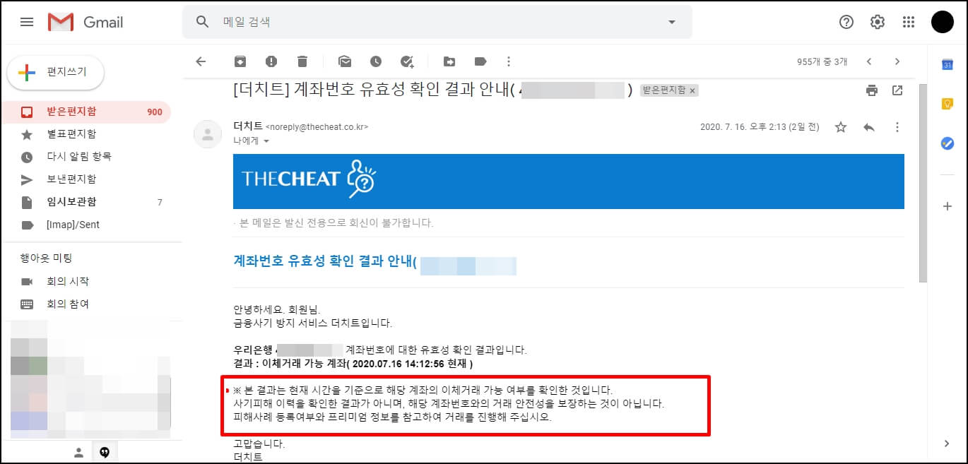 중고 라디오를 구입했을 때 상대방의 계좌번호 유효성 확인 신청 후에 받은 답신 메일입니다. 해당 계좌로 사기 이력은 조회되지 않았지만 그렇다고 해서 중고 거래의 안전성을 100% 보장하는 것은 절대 아닙니다.