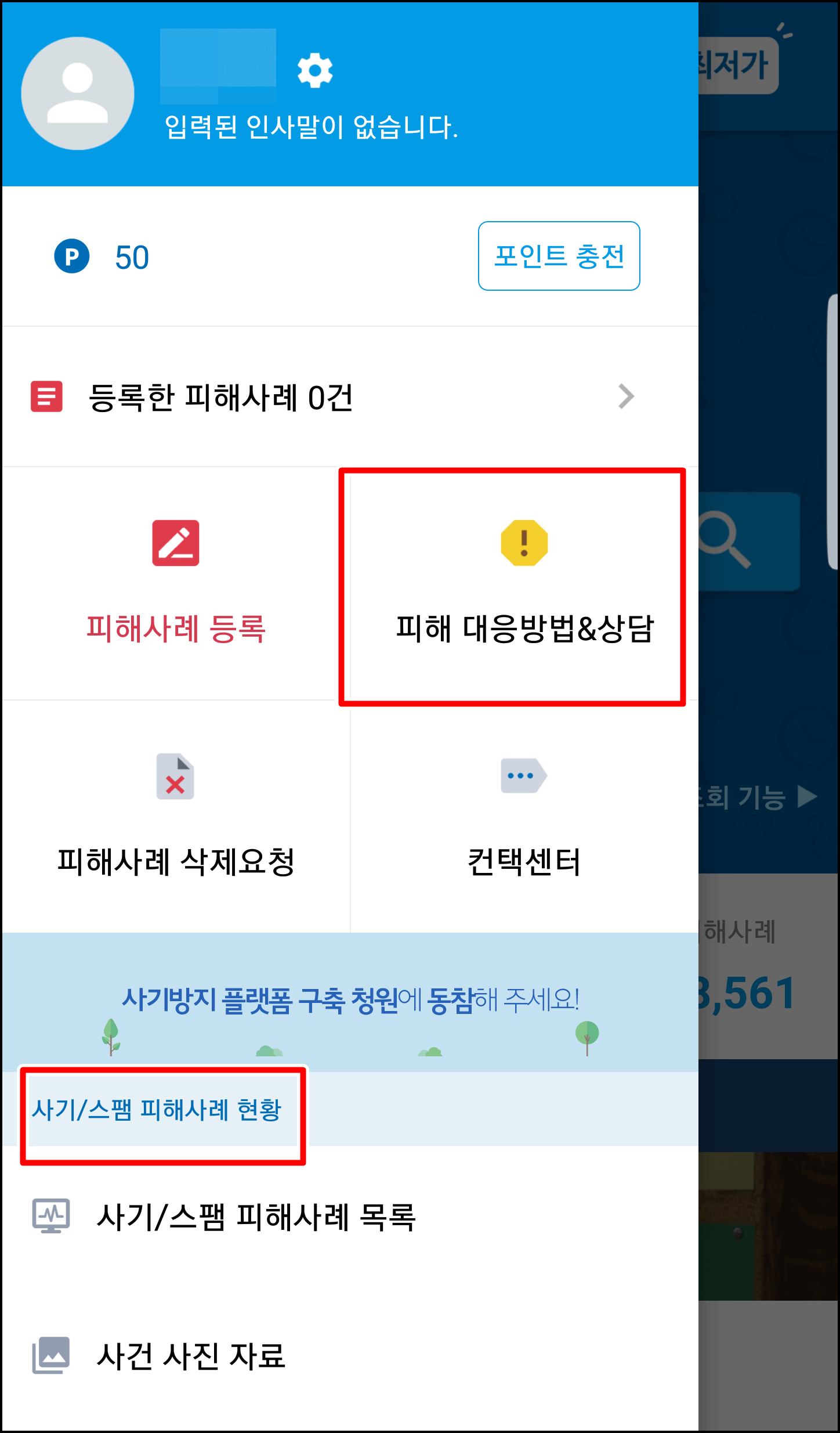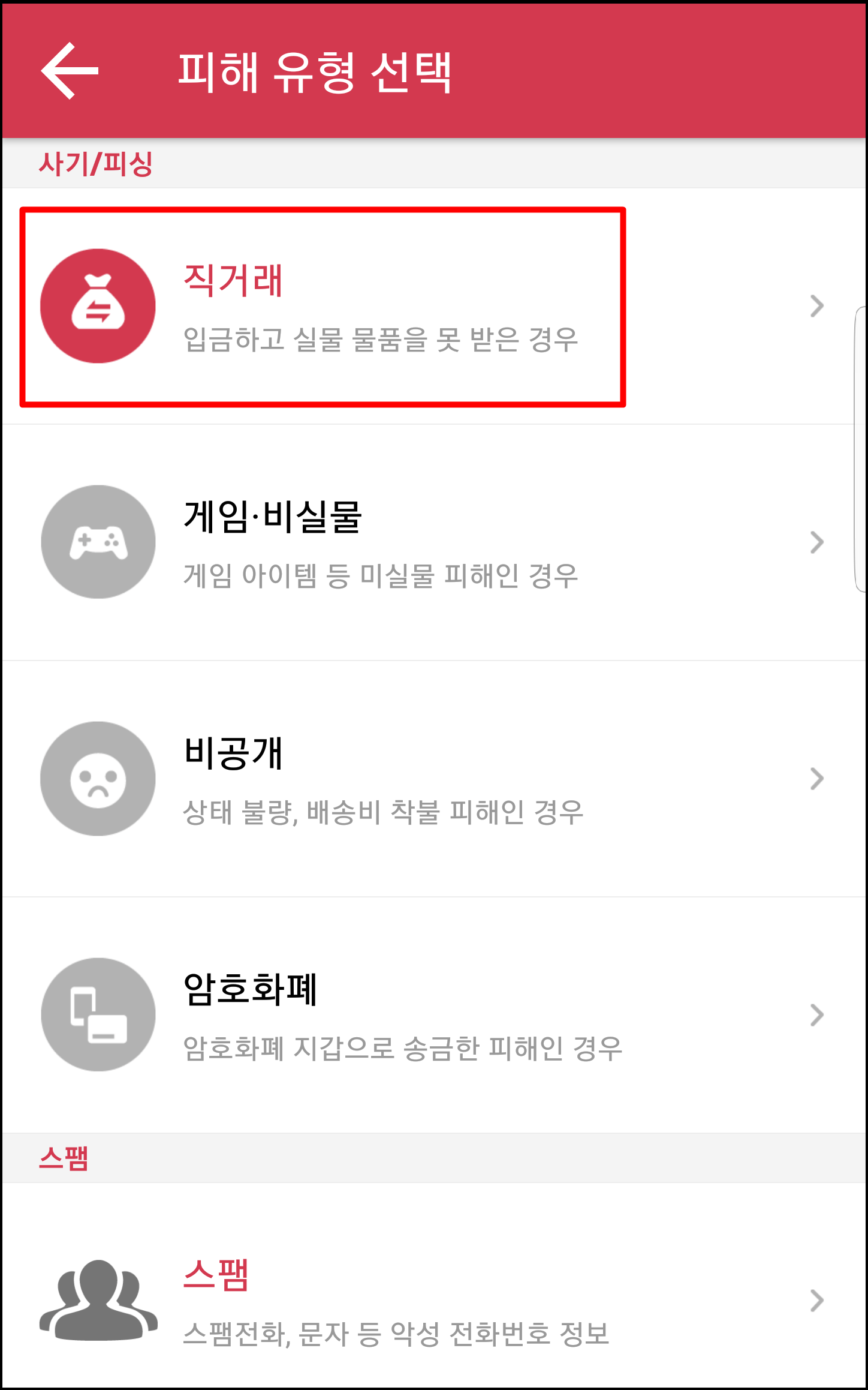 이 탭에서 자신의 피해 유형을 선택하신 후