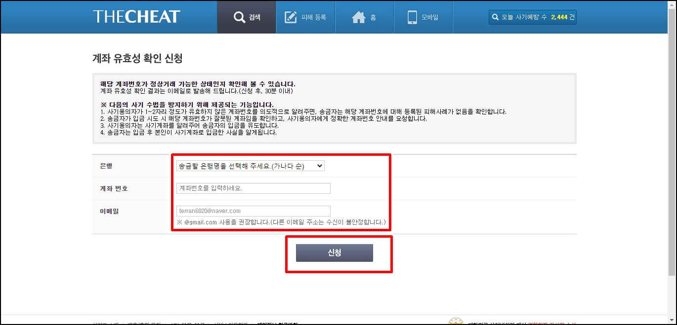 계좌 유효성 확인 신청을 클릭하시면 상대방의 은행, 계좌 번호와 답변을 받을 이메일을 입력하시고 신청을 누르시면 됩니다. G메일이 아닌 다른 형식의 메일들은 수신이 불안정하므로 구글에서 제공하는 G메일의 사용을 권장합니다. 한 가지 안 좋은 점은 바로 조회할 수 있는 게 아니고 최소 10분~30분까지 시간이 걸린다는 점 참고하시길 바랍니다.