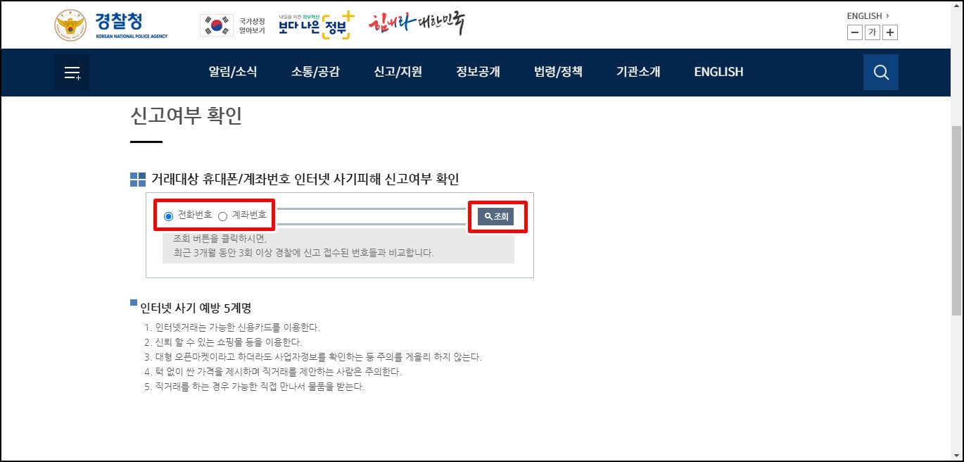 이번에는 경찰청에서 조회하는 방법입니다. 경찰청에서는 전화번호와 계좌번호를 조회할 수 있습니다. 경찰청에서는 인터넷 사기 예방을 위해 5가지 계명을 제시하고 있는데요..