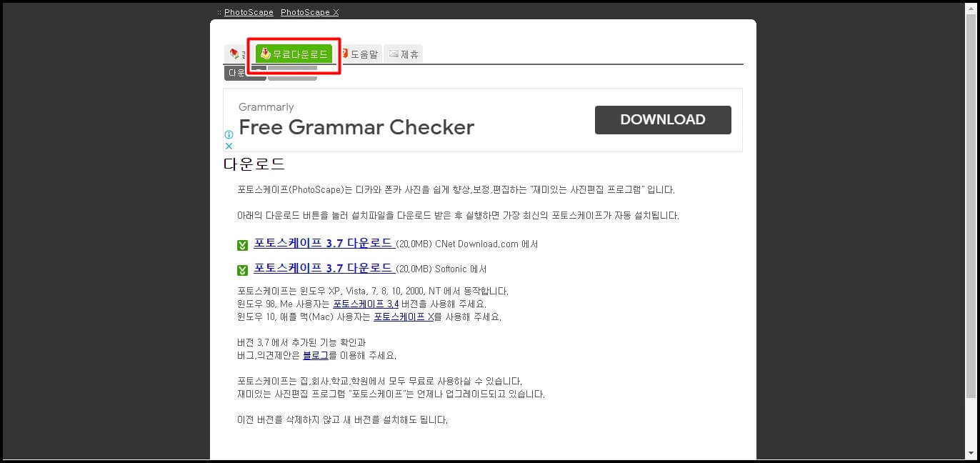 현재 포토스케이프를 Cnet, Softonic이란 통합 자료실에서 운영 중인데 해외에 서버를 두고 있는데 프로그램을 다운로드하는 데는 전혀 지장이 없습니다. 무료 다운로드를 클릭 후 포토스케이프 3.7 다운로드를 클릭합니다. 둘 중에 아무거나 상관이 없습니다.