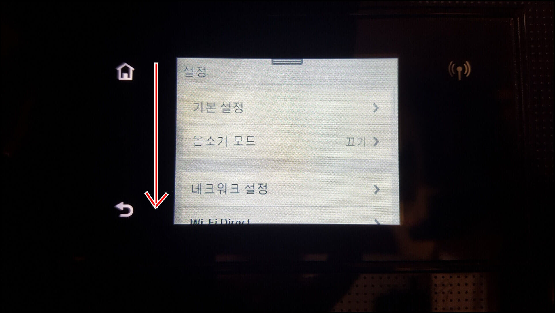 설정 탭에는 여러 가지 기능이 있습니다. ▲기본 설정, ▲음소거 모드, ▲네트워크 설정, ▲Wi-Fi Direct, ▲팩스 설정, ▲카트리지 정보, ▲프린터 유지보수, ▲전원 관리, ▲보고서 등의 설정 탭이 있습니다. 여기서 우리는 '프린터 유지보수'로 접속해야 합니다. 아래로 조금 내려보겠습니다.