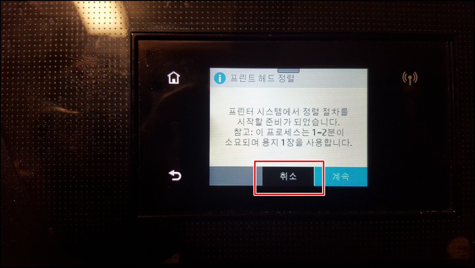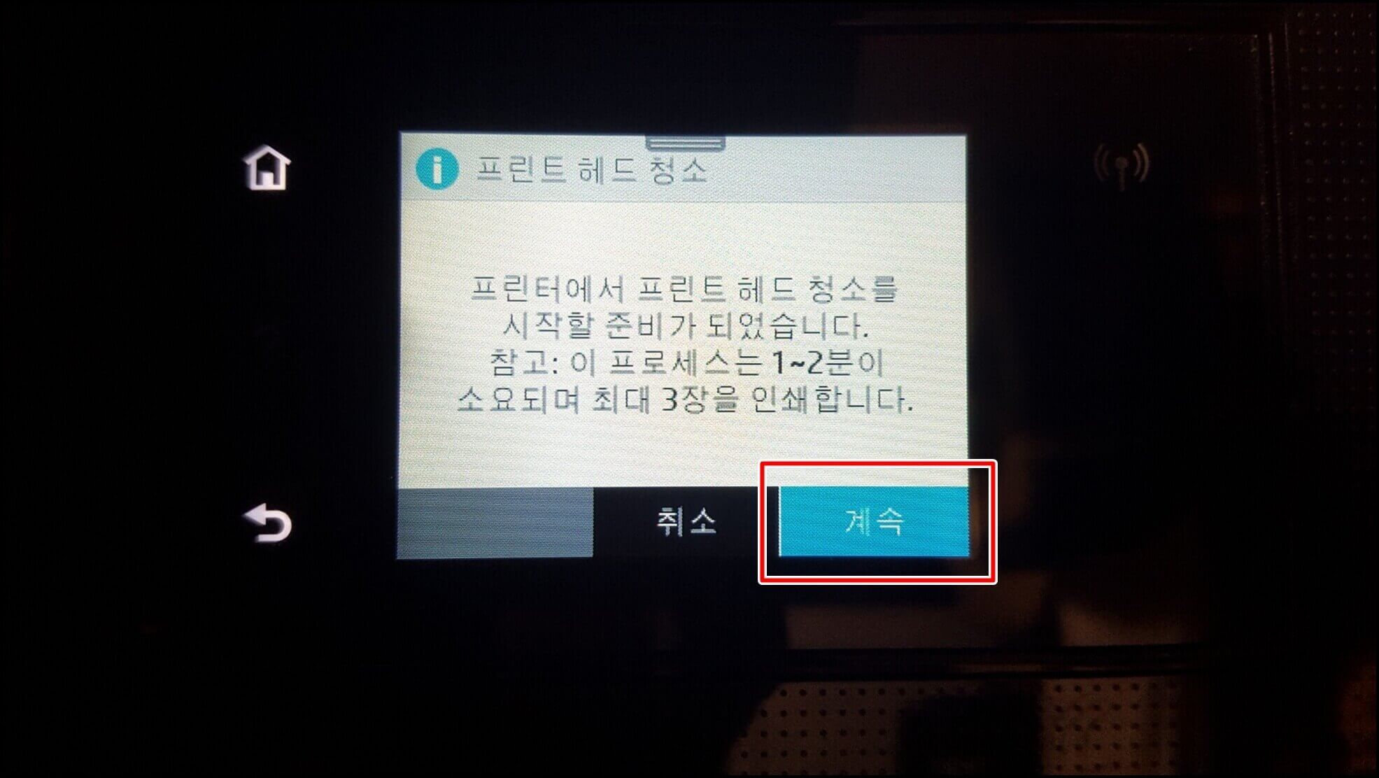 먼저 헤드 청소부터 해보겠습니다. 헤드 청소하는 데 소요되는 시간은 약 30초~1분 사이입니다. 한번 청소할 때마다 A4용지 1장이 소모됩니다. 계속을 눌러보겠습니다.