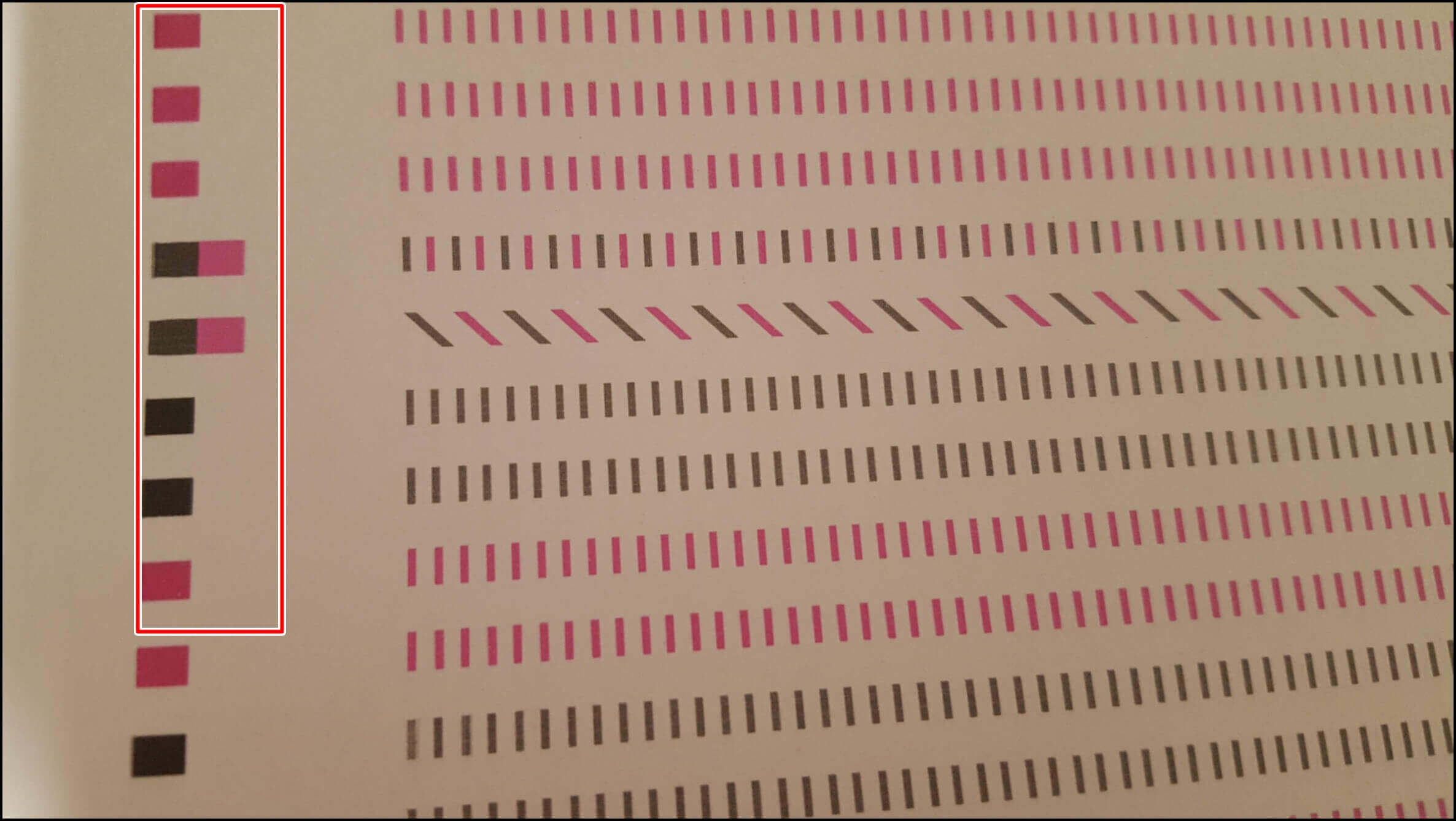 8710 설정 탭에서는 카트리지 상태를 확인할 수 있는 인쇄 품질 보고서를 출력할 수 있습니다. 패턴 1, 2의 테스트 걸쳐 헤드 상태가 어떤지 확인할 수 있는데 ▲패턴 1은 헤드 정렬, ▲패턴 2는 헤드 청소 영역입니다. 제가 쓰는 복합기에는 주로 정렬 쪽에서 문제가 발생하고 있는데 이건 출력량이 많기도 하지만 노후로 인한 문제이기 때문에 나름 관리를 해줬는데도 이 정도입니다. 그래도 전체적인 인쇄 품질은 좋은 편이므로 만족합니다. 패턴 2에서도 노후로 인한 가느다란 실금이 보입니다.