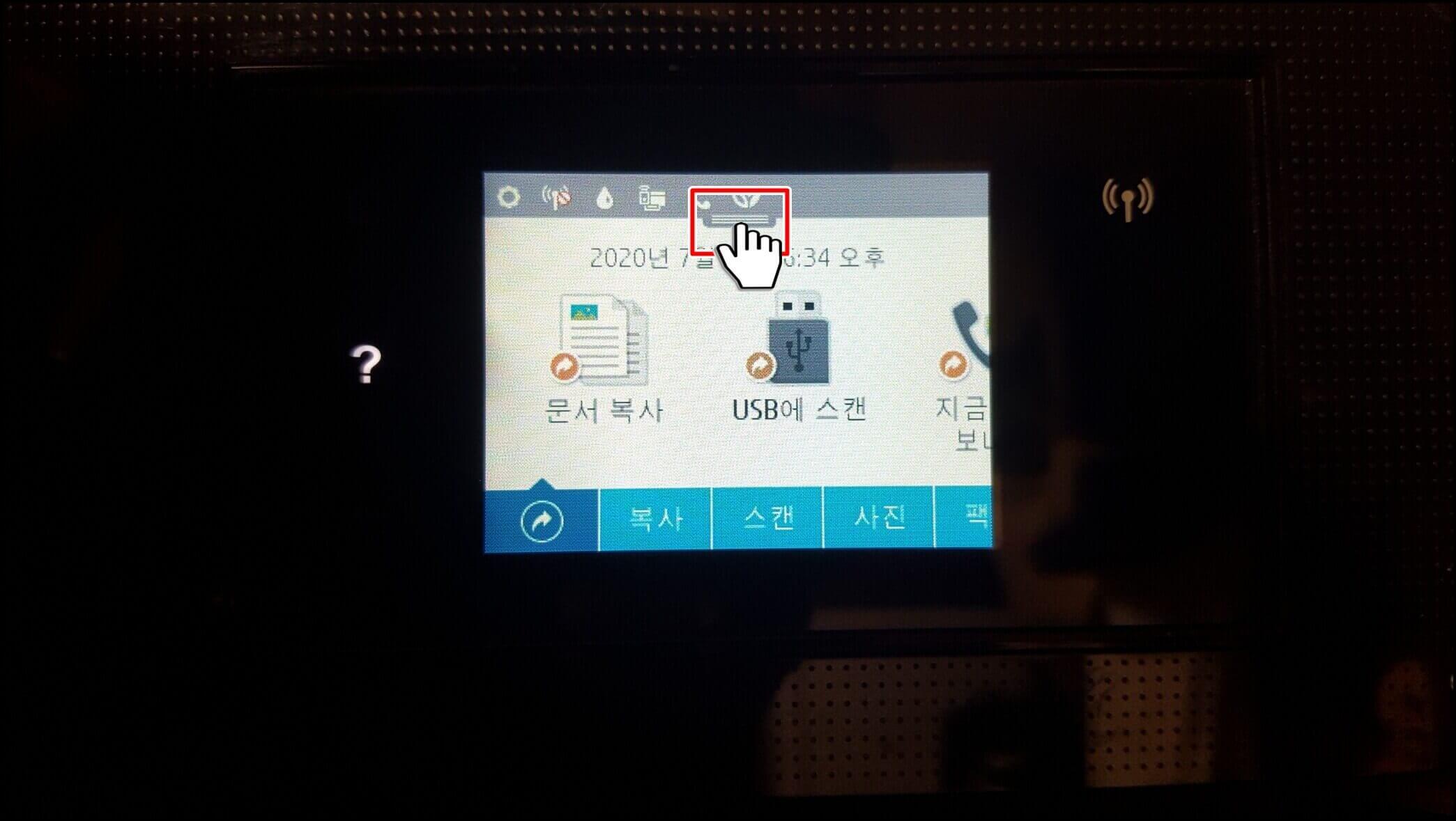 헤드 정렬과 청소는 프린터 유지 보수 탭에서 관리할 수 있습니다. 먼저 복합기 메인 화면에서 아래와 같이 누르고 끌어내립니다.