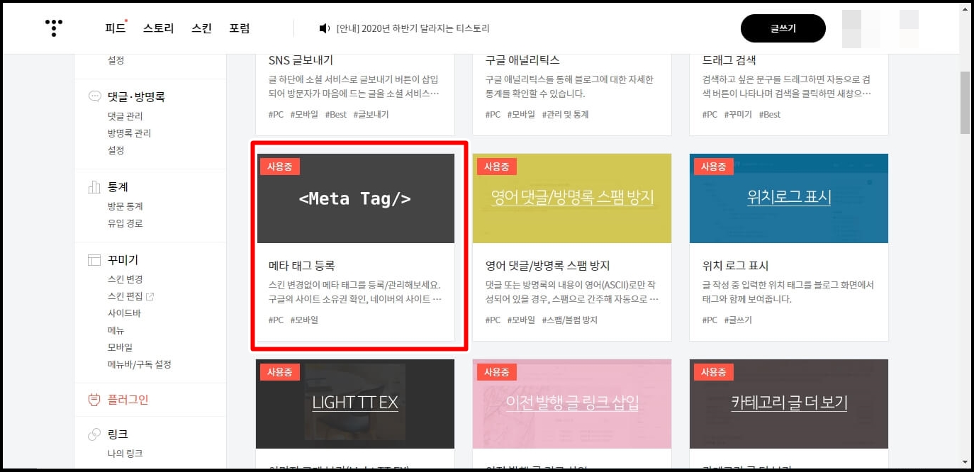플러그인 중에서 메타 태그 등록을 클릭합니다.