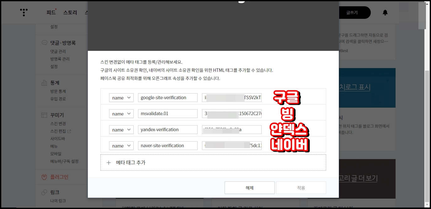 대신에 애드센스를 승인받기 위해 HTML에 붙여 넣기 했던 메타태그는 스크립트 형식이기 때문에 플러그인 메타태그에 등록하시면 안 되며 절대 건드려서도 안됩니다. 이 부분만 주의하셔서 등록해놓은 메타태그를 전부 옮겨서 등록하시길 바랍니다.