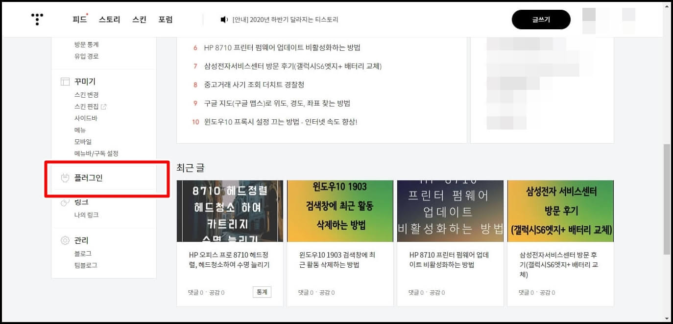티스토리 블로그 설정 페이지에 접속하셔서 좌측 하단에 플러그인을 클릭합니다.