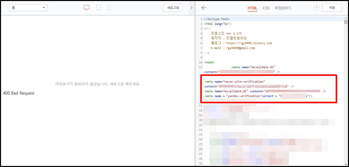 HTML 편집에 들어가셔서 아래와 같이 메타태그를 복사하시면 됩니다. 플러그인에 등록하셨다면 HTML에서는 삭제하셔도 무방합니다.