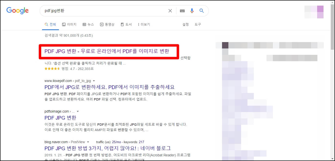 구글에서 PDF JPG 변환을 검색하시고 첫 번째 사이트를 클릭합니다.